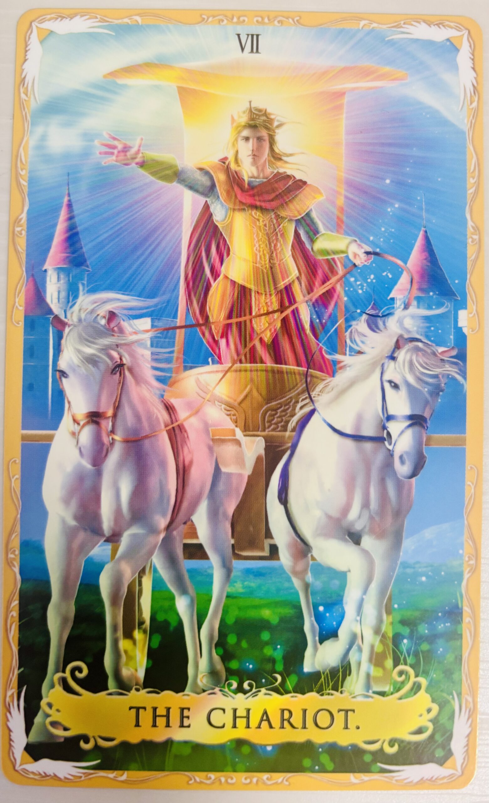 黄金の羊の背に乗り、空を駆け抜ける姿は、まさに「戦車」のカードそのもの。